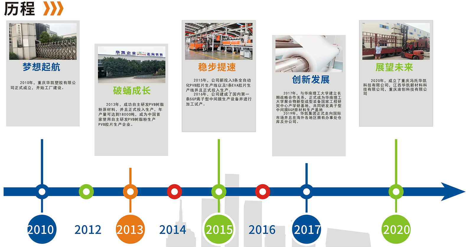 重慶華凱塑膠有限公司于2014年3月13日正式注冊成立,占地面積56000平方米,廠房面積35000多平方米,固定資產7300余萬元,總投資1億3千萬元人民幣;是重慶市PVB樹脂、PVB膠片,SGP膠片,EVA膠片,HUD楔形PVB膠片玻璃中間膜專業制造企業。
